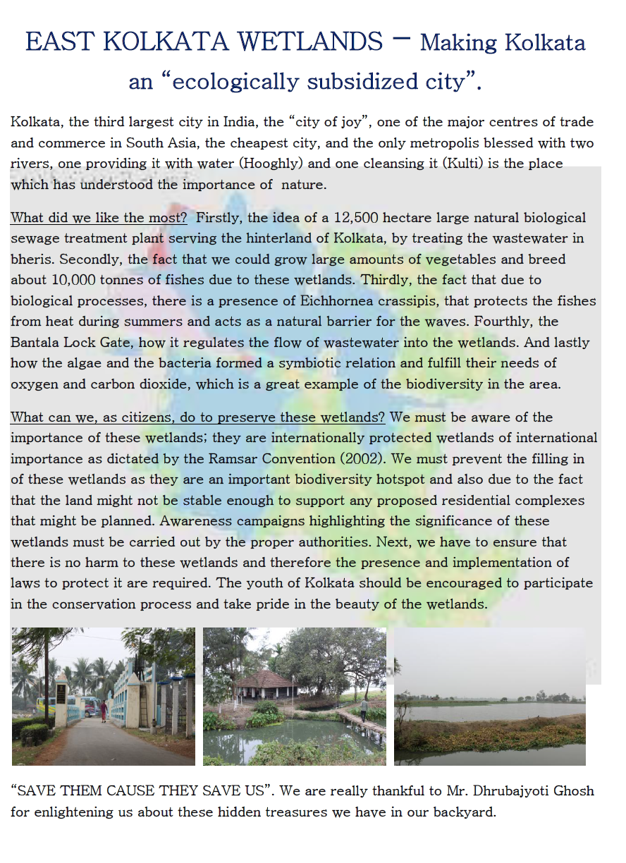 - Children from three schools – two based in Kolkata and one from Germany, participated in one of the educational tours to the wetlands. These schools were Sushila Birla Girls High School and Birla High School (for boys) from Kolkata and Abendroth Gymnasium from Cuxhaven, Germany. They were divided into six groups and after conducting the lecture tour, they were told to take part in an essay competition where they had to write one page about what appealed to them and what they thought could be done to save the wetlands. The presentation of the group that stood first has been pasted below.