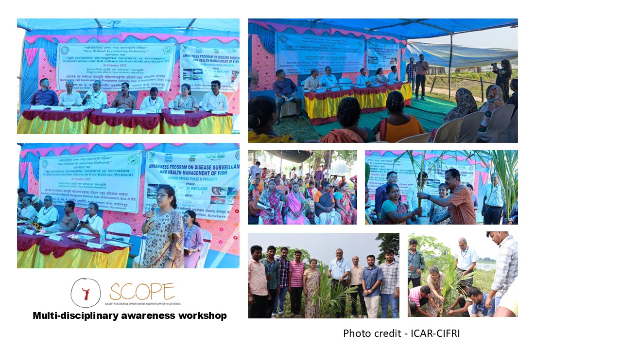 SCOPE provided guidance in hosting the workshop, to both ICAR-CIFRI and Jhagrasish Bhery. It was on SCOPE’s advice that coconut saplings were procured and distributed among workshop attendees, and that was deeply appreciated. The attendees were trained regarding pond health management, and fish disease. They also placed before the scientists, the production challenges that they faced. Overall, it was agreed upon that the Bhery and the surrounding neighbourhood would work in close cooperation with, and guidance from, the scientific community.